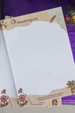 Bloco de notas de 50 páginas  tamanho 15×10,5cm com a arte da editora nas bordas.