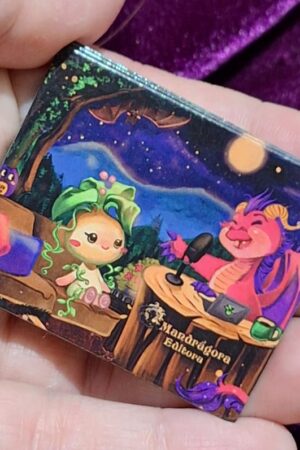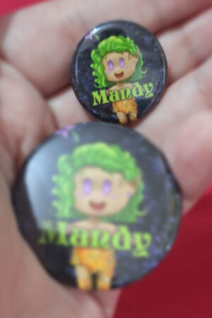 Mini bótom redondo com a arte da mascote da Mandrágora, tamanho 2,5cm.