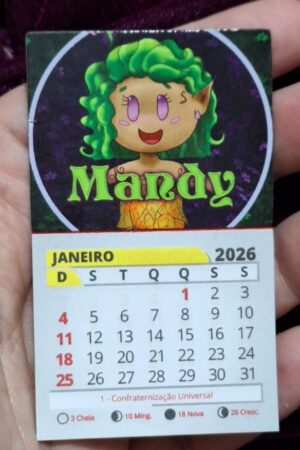 Calendário com folhas destacáveis (tipo bloquinho) preso a um ímã para geladeira, tamanho 8x5cm.