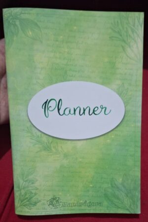 Planner semanal 100 páginas com calendário, tamanho 14×21, capa verde, miolo preto e branco, lombada grampeada.